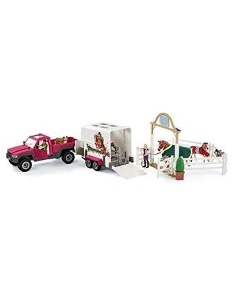Complete Schleich excursie set met auto en trailer, paarden en vele accessoires als toegangshekken en stalling en hondenhok.