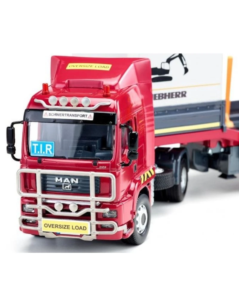 Met de nieuwe platformopbouw is de populaire SIKUCONTROL set MAN trekker met dieplader uitstekend uitgerust om de SIKUCONTROL Liebherr rupsgraafmachine R980 SME veilig naar de bouwlocatie te vervoeren. De opbouw wordt eenvoudig op de dieplader geplaatst. Hierdoor worden het platform en de uitklapbare oprijplaten verbreed. Door de mogelijkheid om panelen op het brede platform te plaatsen kan de dieplader ook worden ingezet voor andere extra brede uitzonderlijke transporten. Voor het vervoer van lange materialen zoals hout, buizen, staven etc. kunnen rongen worden ingestoken. In de set worden rongen in drie lengtes meegeleverd, acht stuks van elk. De platformopbouw worden aangevuld met een laadbak met huif op het plateau boven de koppeling. Daar kunnen dan veilig riemen, onderlegwiggen en pylons worden opgeborgen. Vrachtwagenchauffeurs vinden het leuk om hun trucks optisch aan te kleden. De nieuwe set biedt nu de mogelijkheid om ook de trekkers van de SIKUCONTROL sets MAN trekker met dieplader en Scania trekker met kipper-dieplader individueler vorm te geven: De verchroomde bullbar wordt eenvoudig opgestoken en geeft het front van de beide trekkers een krachtige uitstraling. De lampenbeugel – ook een populair accessoire bij vrachtwagenchauffeurs – kan zonder schroeven achter de zonwering worden gestoken. Met de motieven van het meegeleverde stickervel kunnen de chauffeurscabine en de oplegger ook individueel vorm worden gegeven.